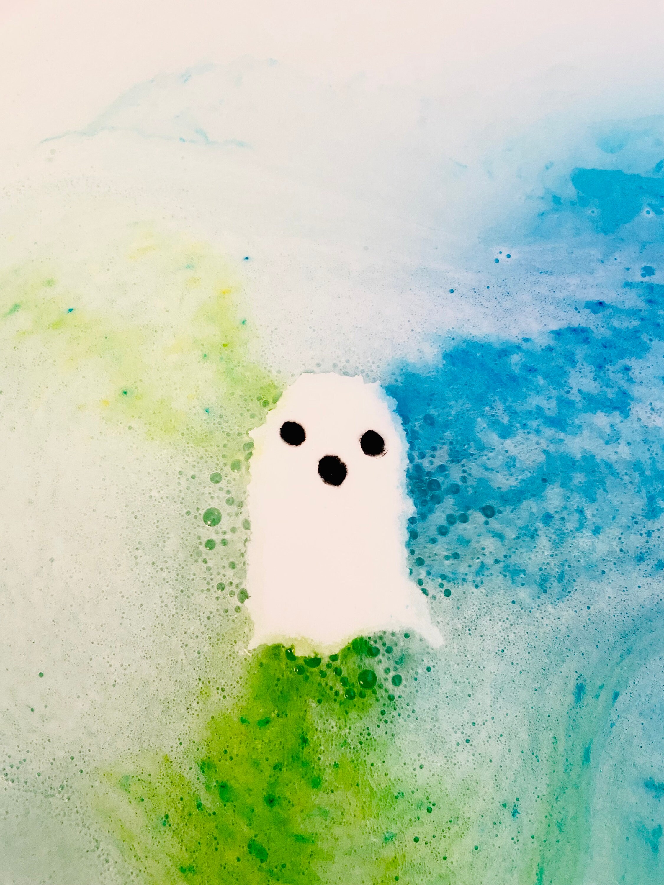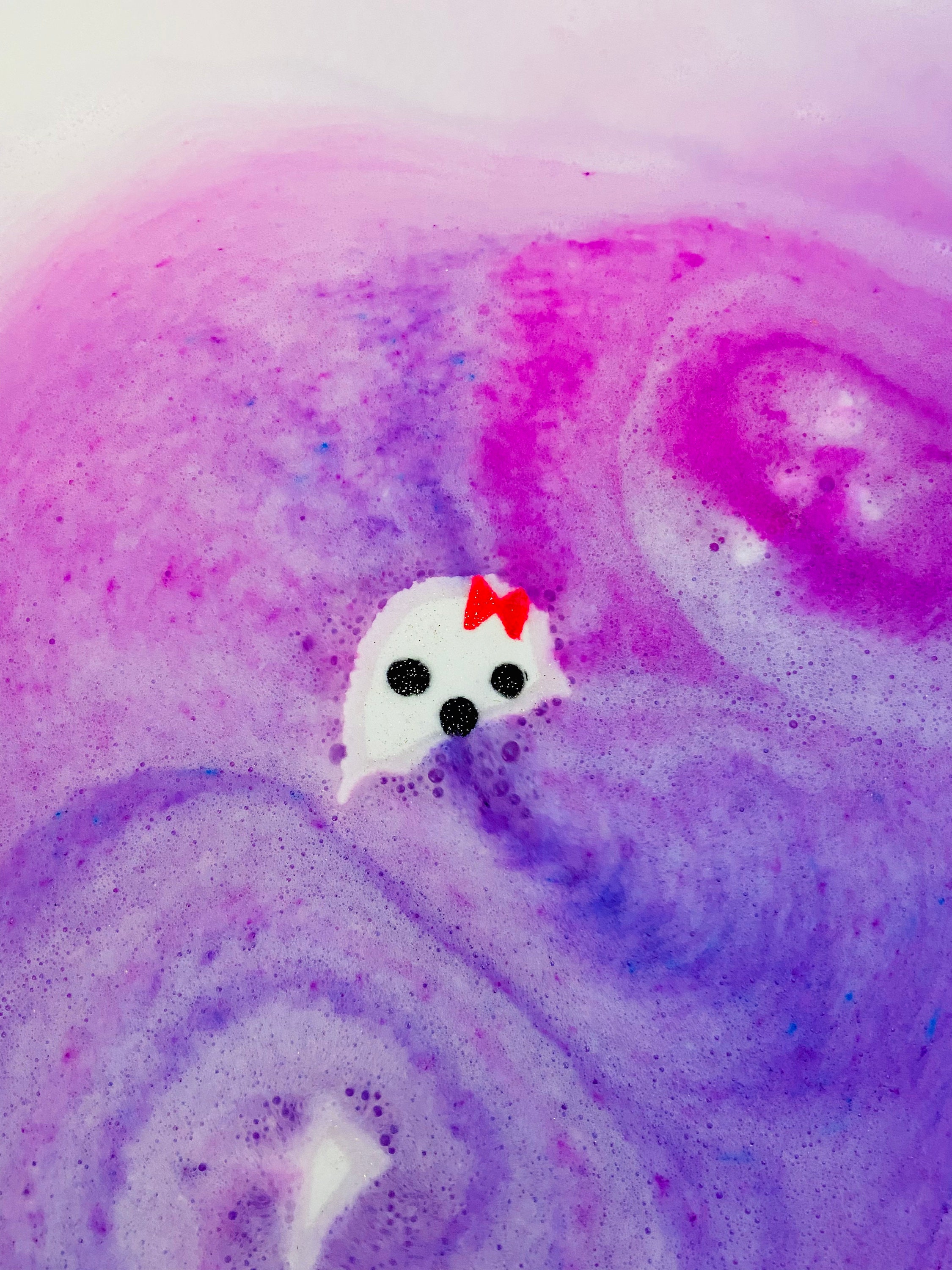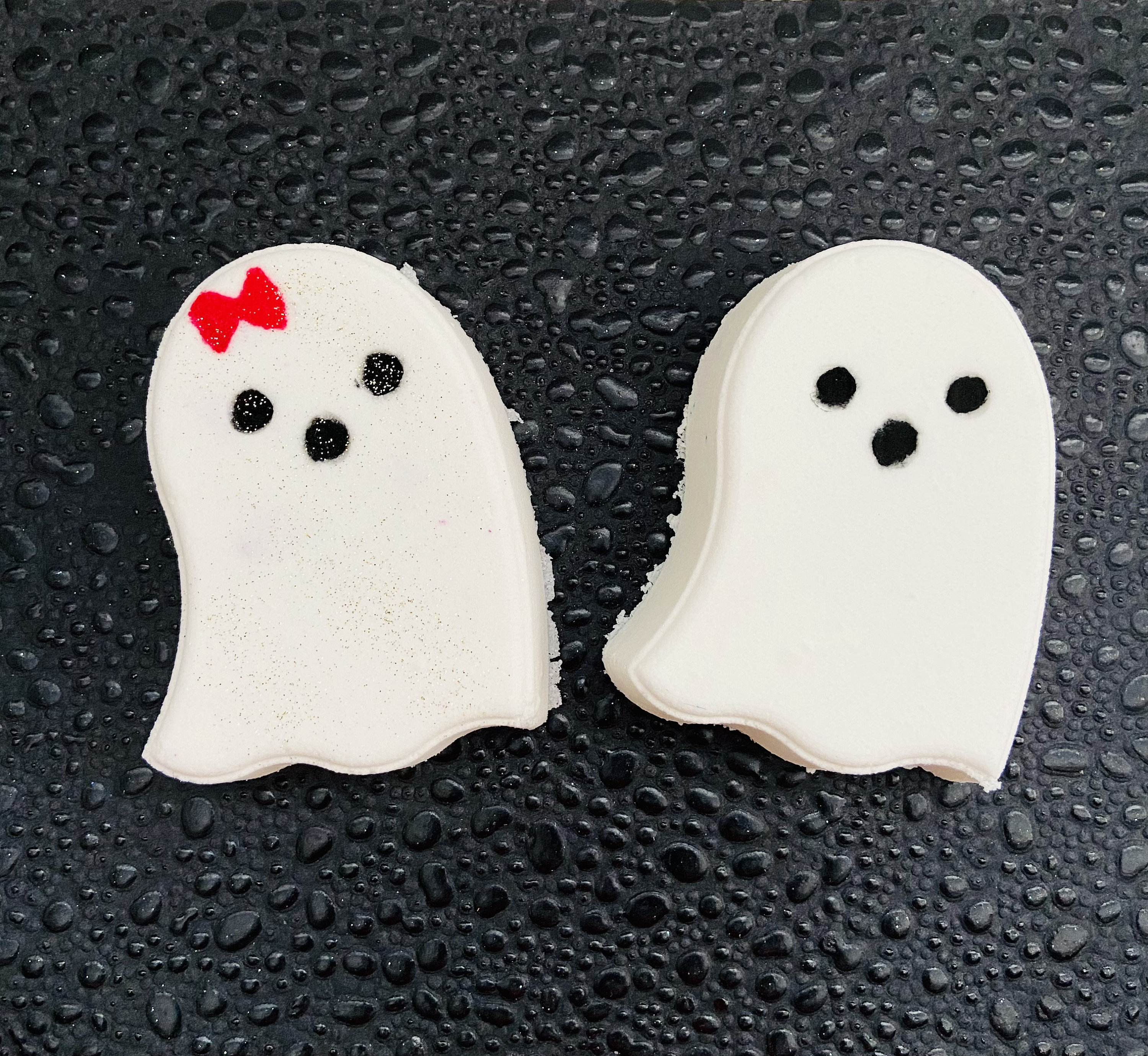 This large, 5 oz. Ghost Bath Bomb is scented in toasted marshmallow. When placed in water, it fizzes and makes water bright and colorful. Choose between boy ghost-color changes water to bright green & blue or girl ghost which changes to hot pink & purple.