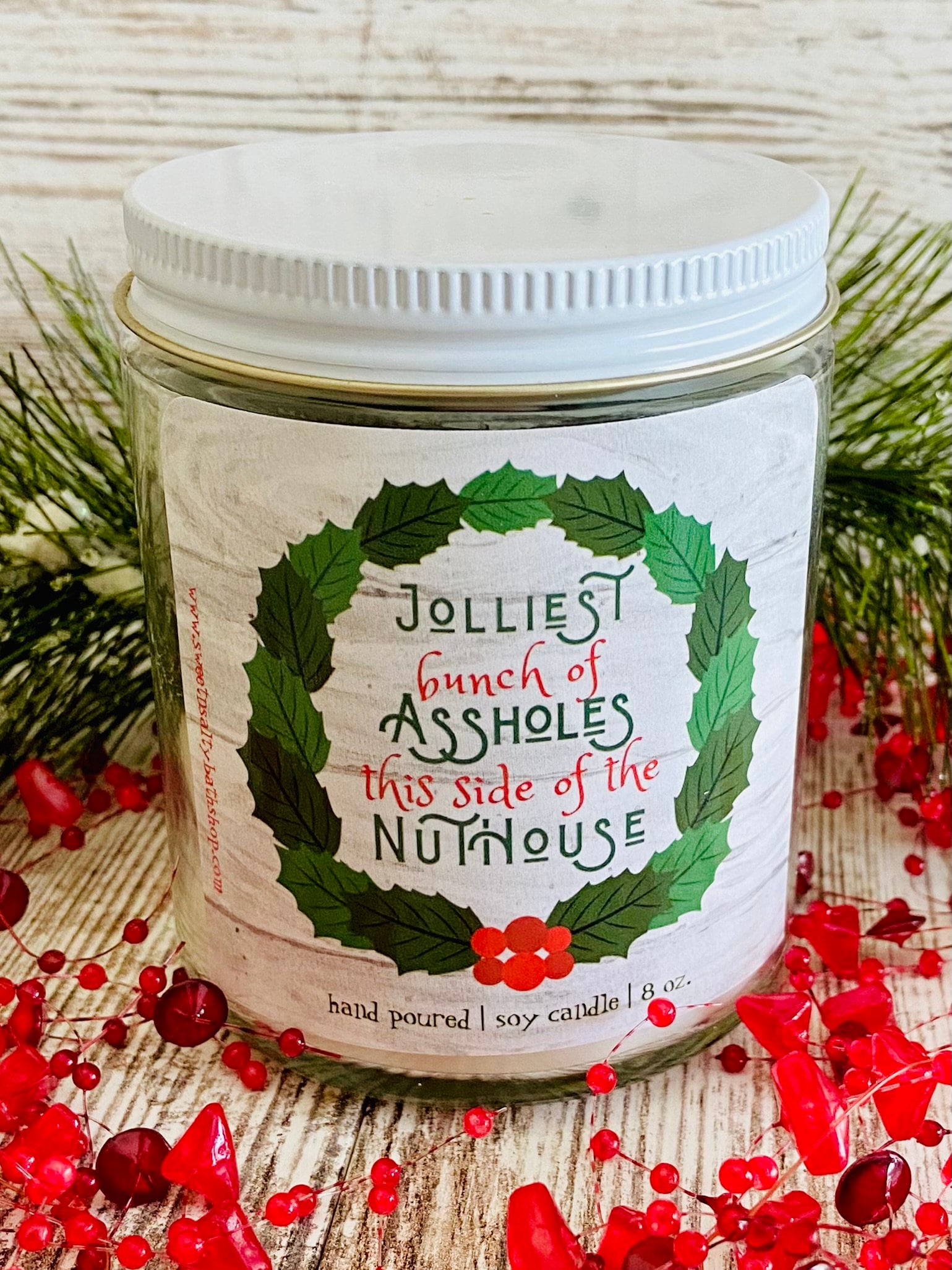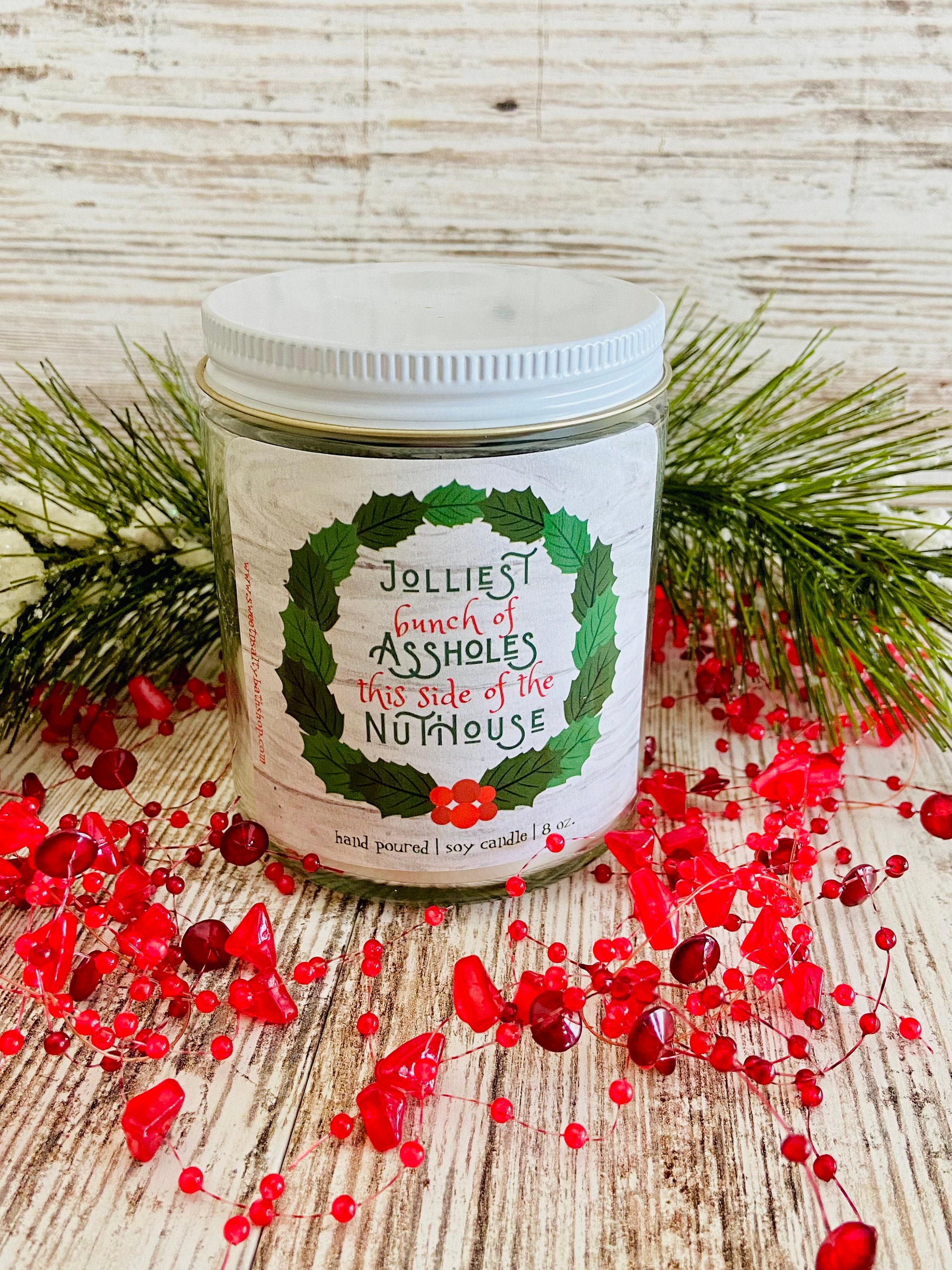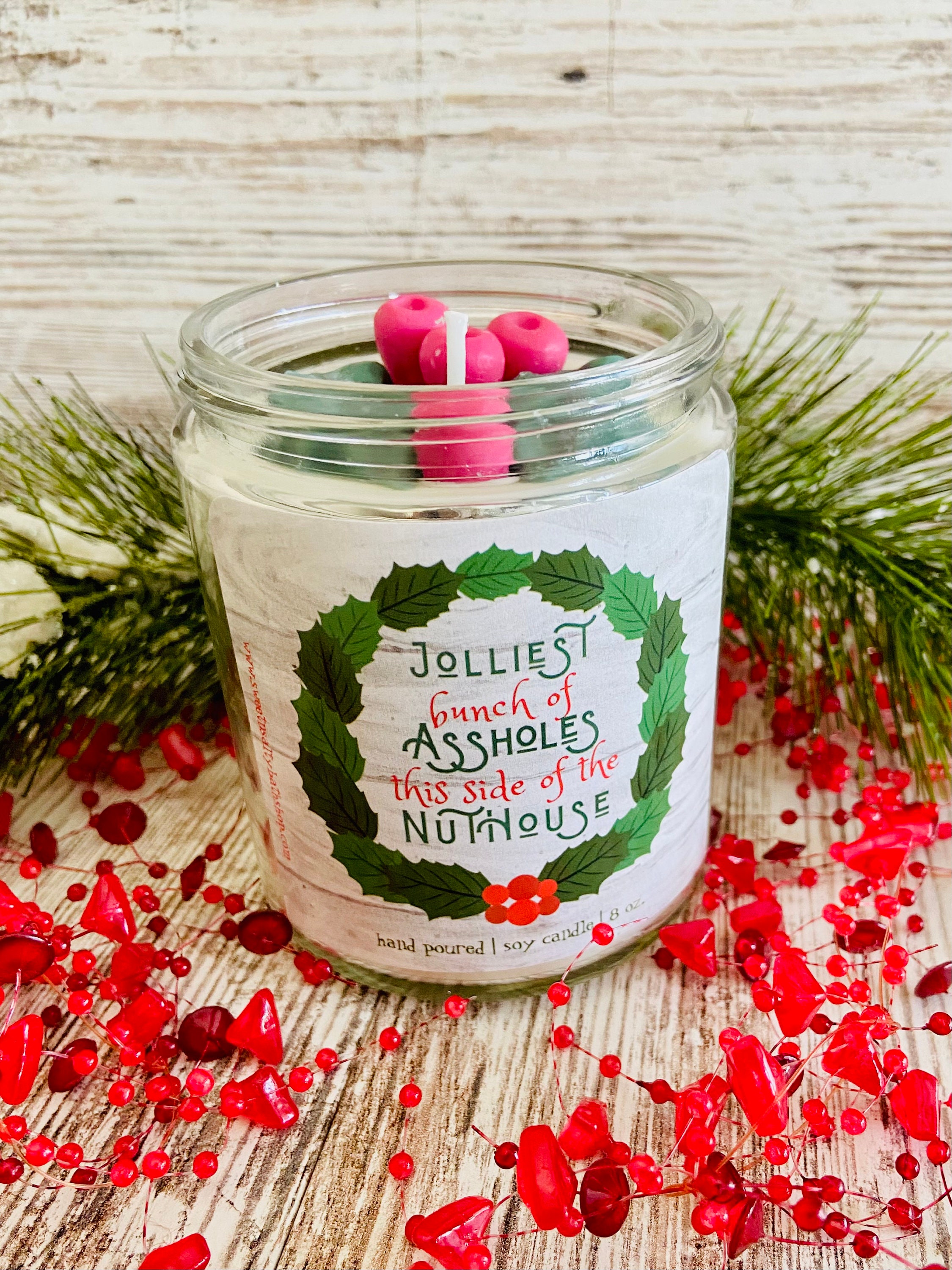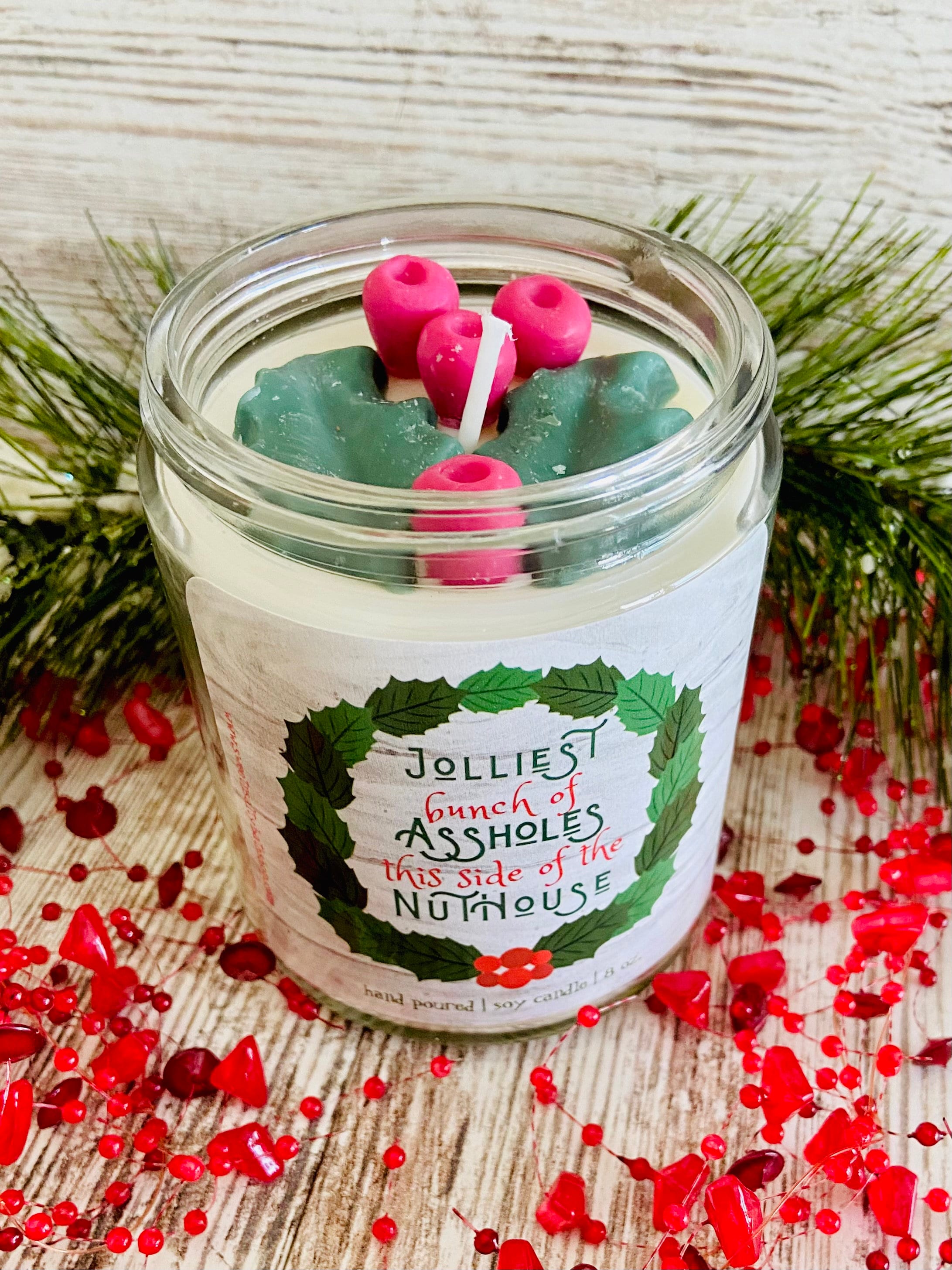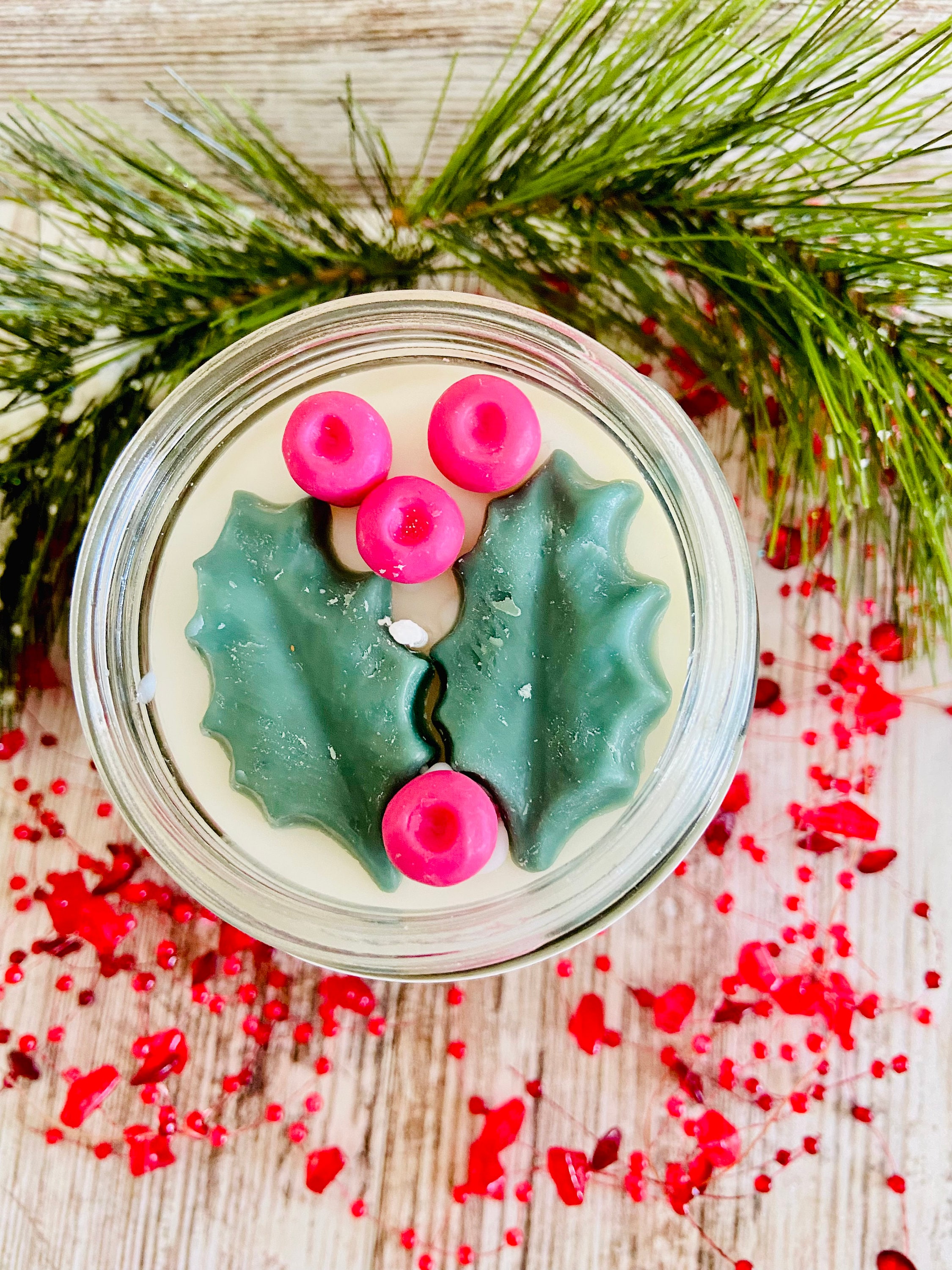 Made with premium soy wax and fragrance oils for long lasting scent and burn time. Candle is scented in holly berry which is a blend of bayberry, pine, cinnamon, clove, and lemon rinds.