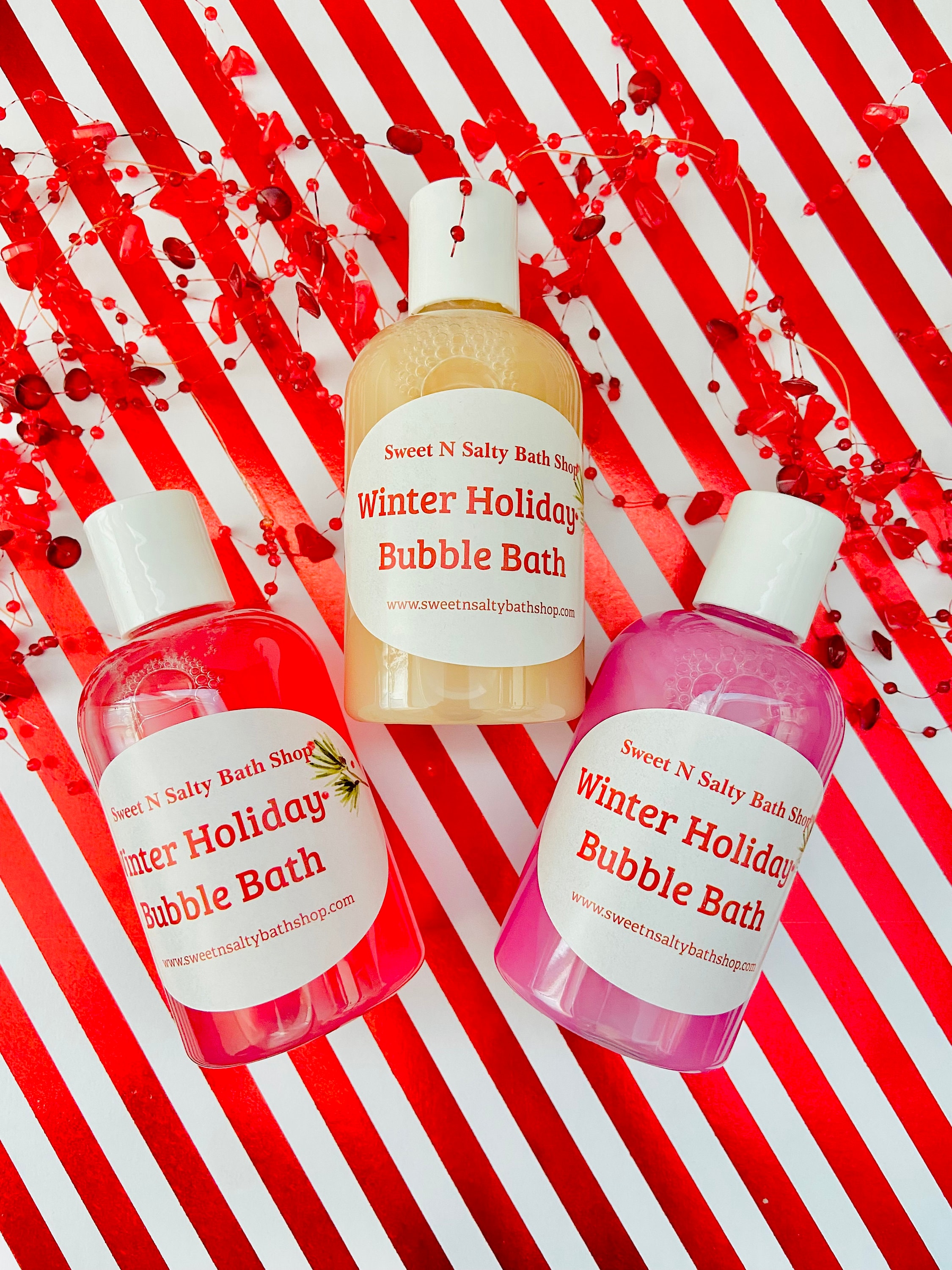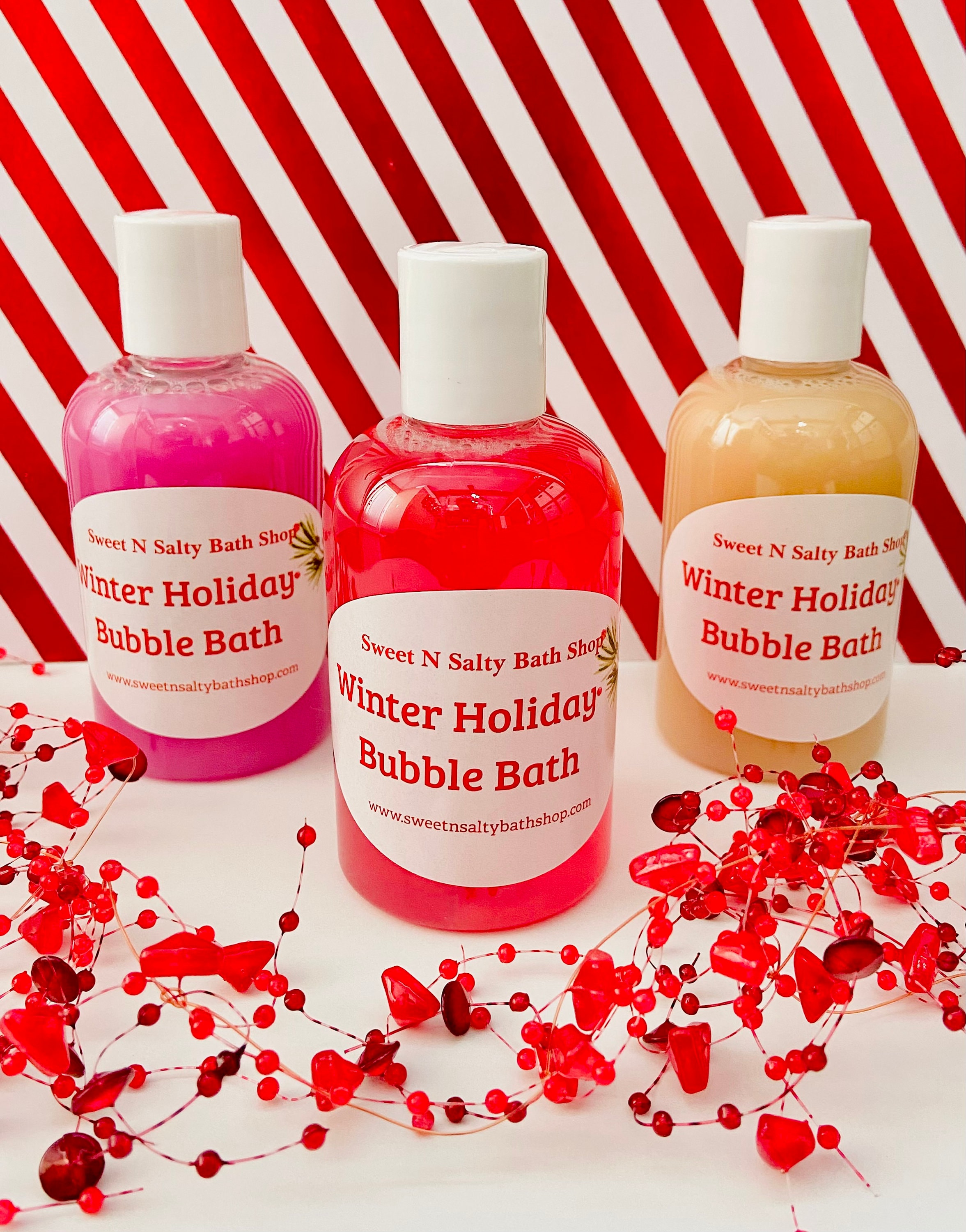 New Holiday scents bubble bath comes in several winter scents and are available in 4 and 8 oz. sizes. Color is made to match scent.