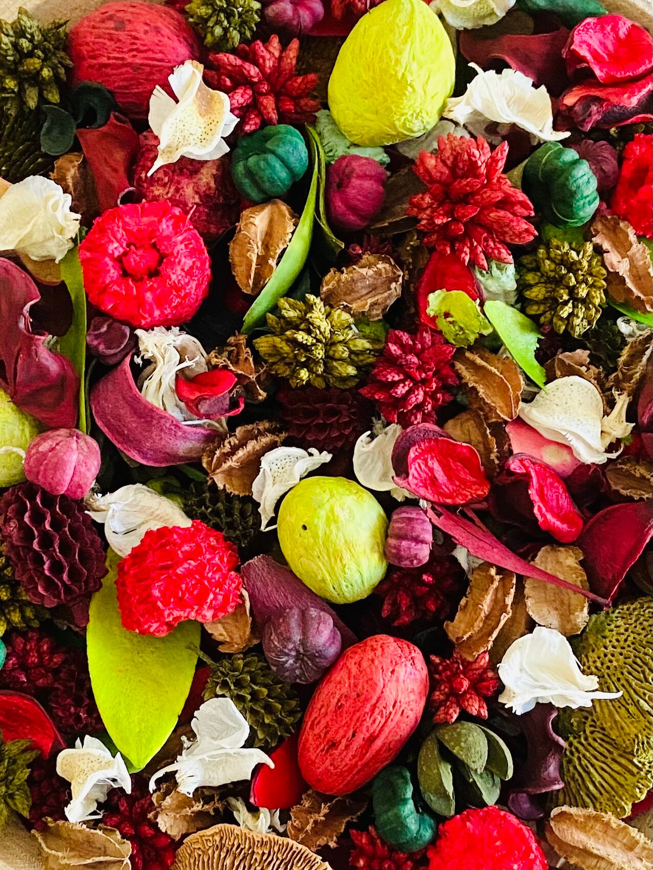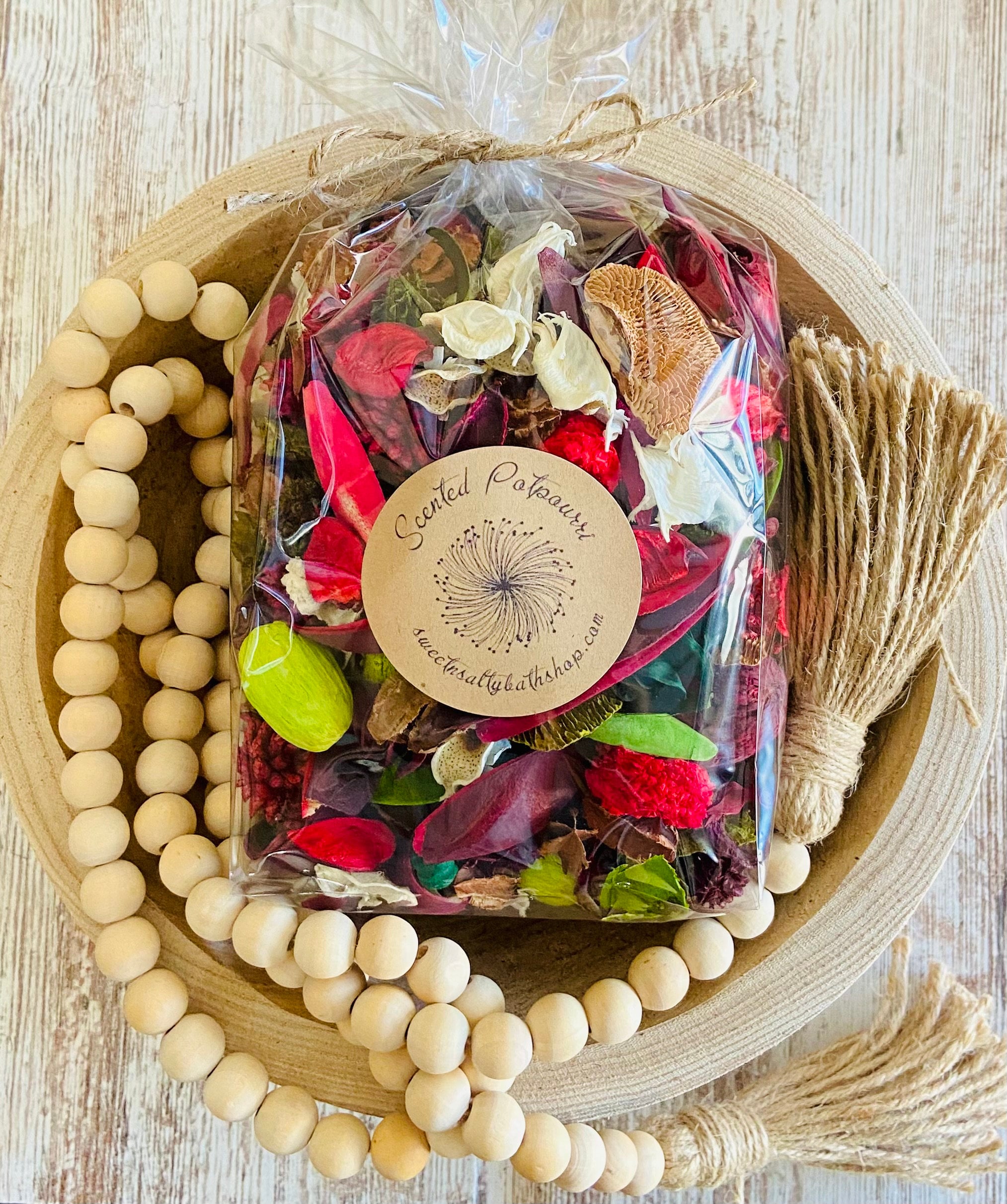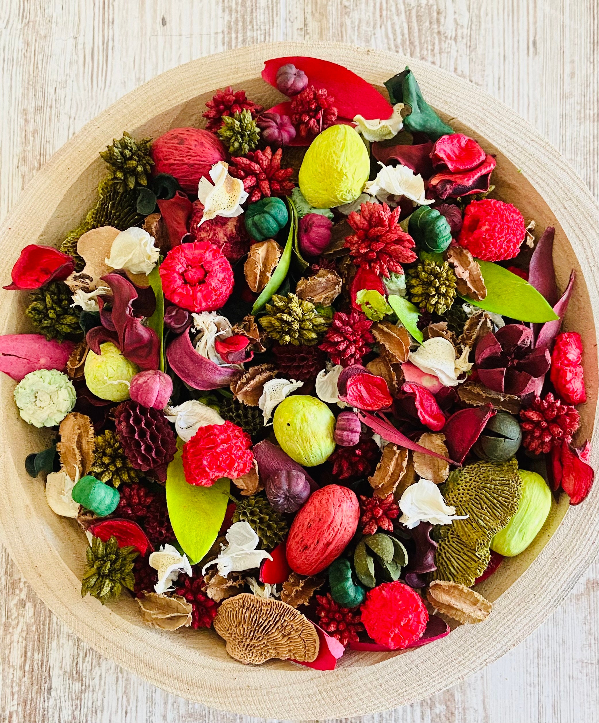 Gorgeous table top small-medium cut bright and colorful potpourri comes scented in your choice of winter holiday fragrance. Perfect for freshening small spaces, drawers, closets, bathrooms, etc. Use as a vase or bowl/dish filler. Holiday potpourri mix contains a various shades of red & green.