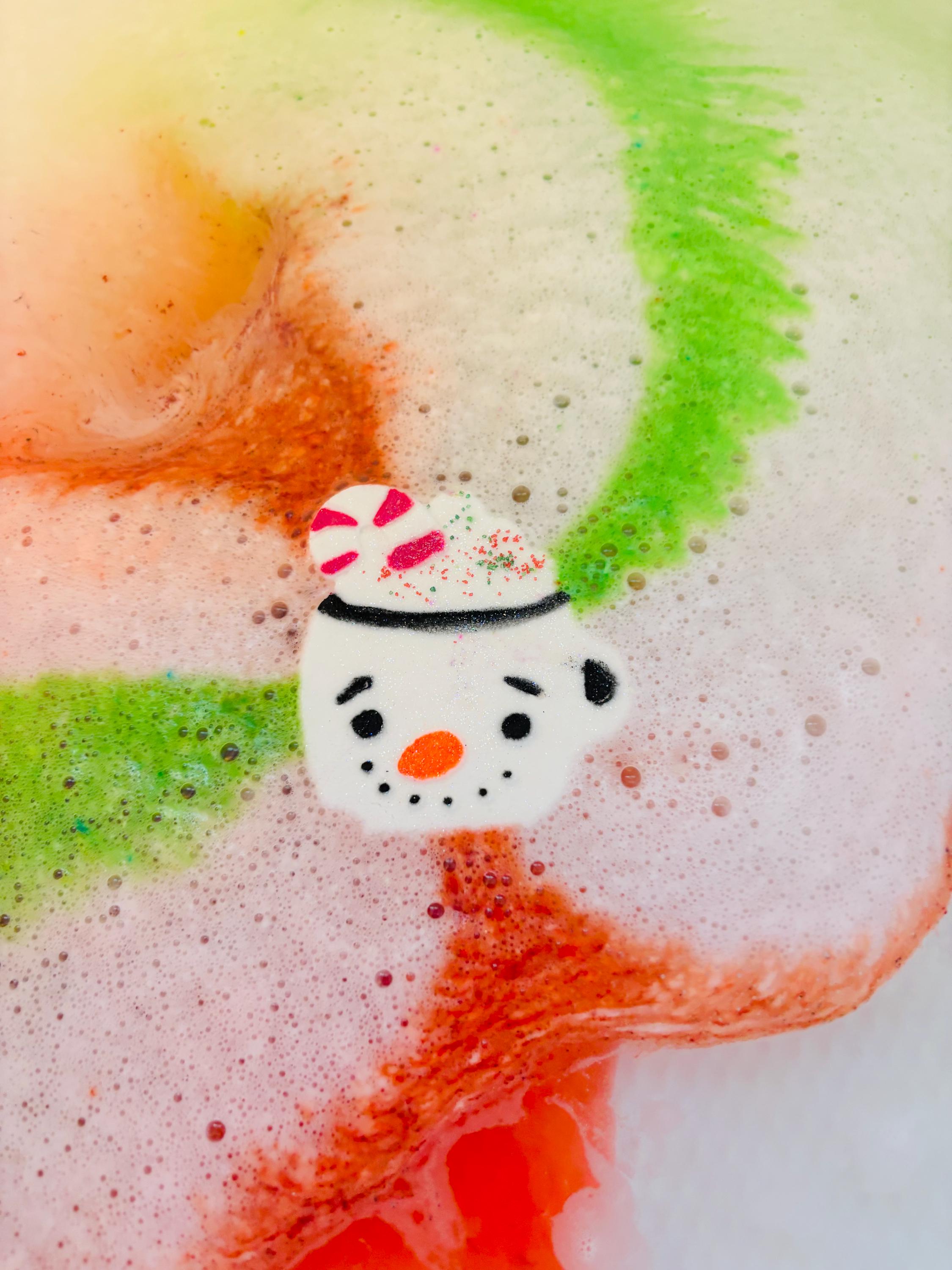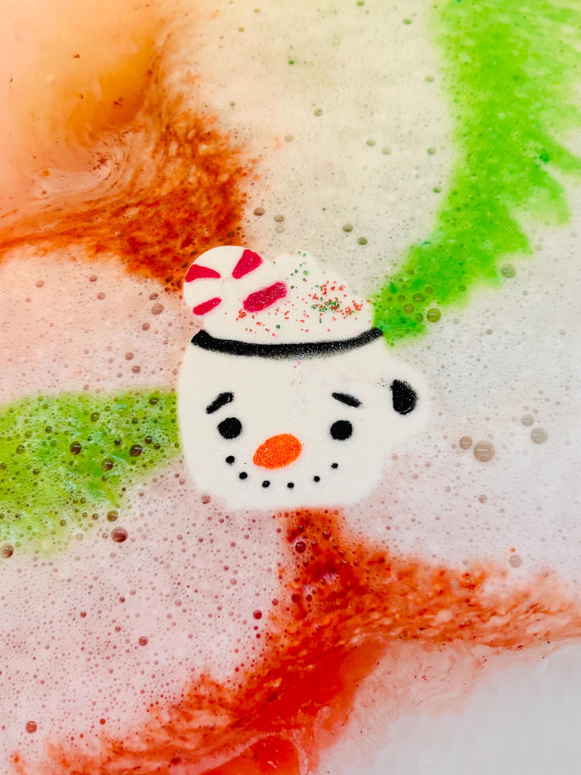 This adorable, hand painted, 4oz. peppermint hot chocolate scented Bath Bomb makes colorful streaks of red & green when using. Made with skin softening coconut oil for moisturizing skin. Perfect for stocking stuffers and holiday gift giving.