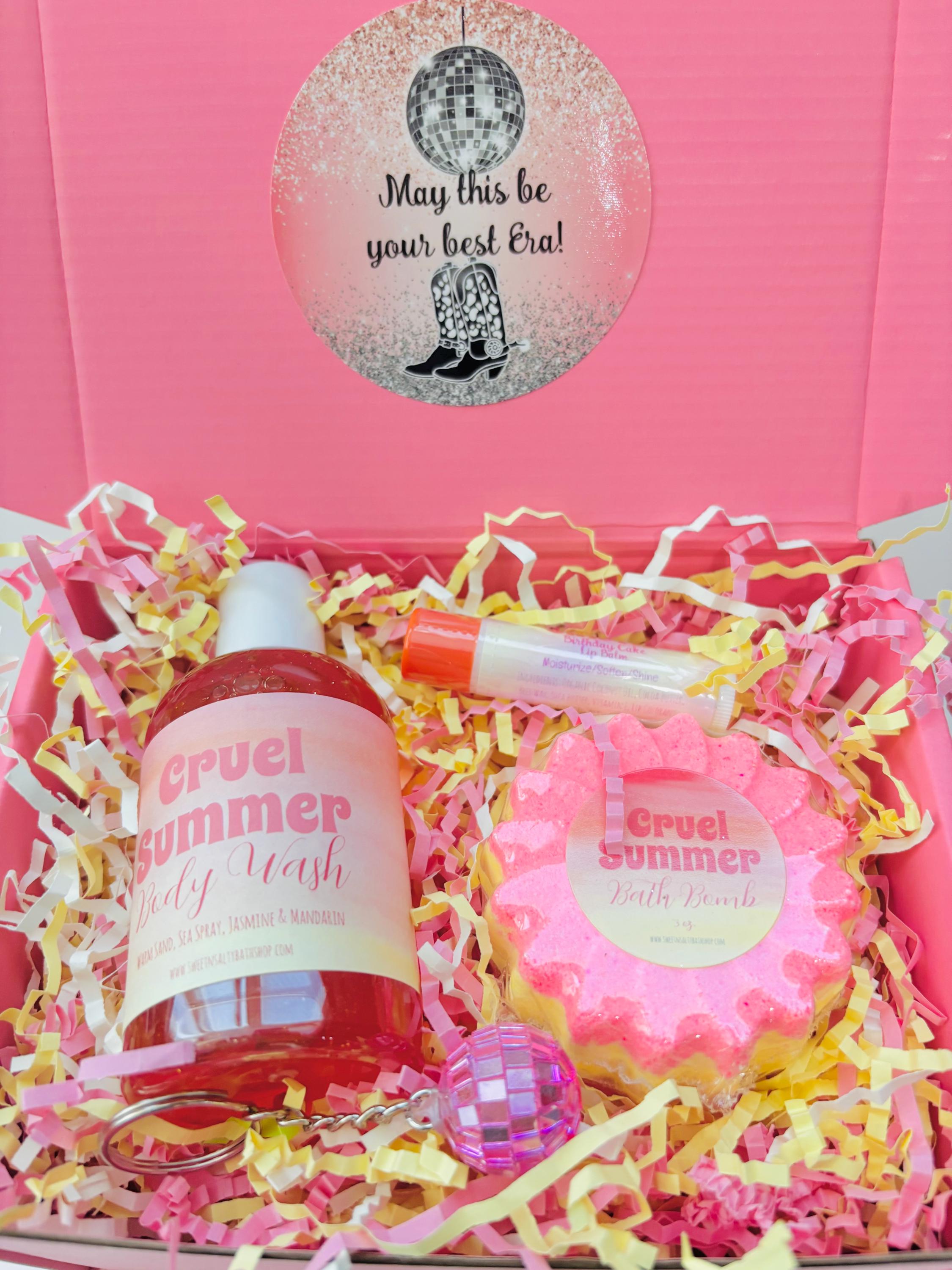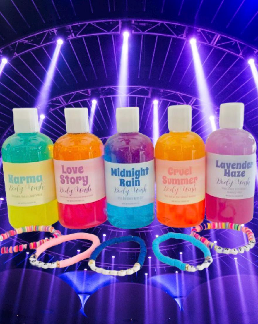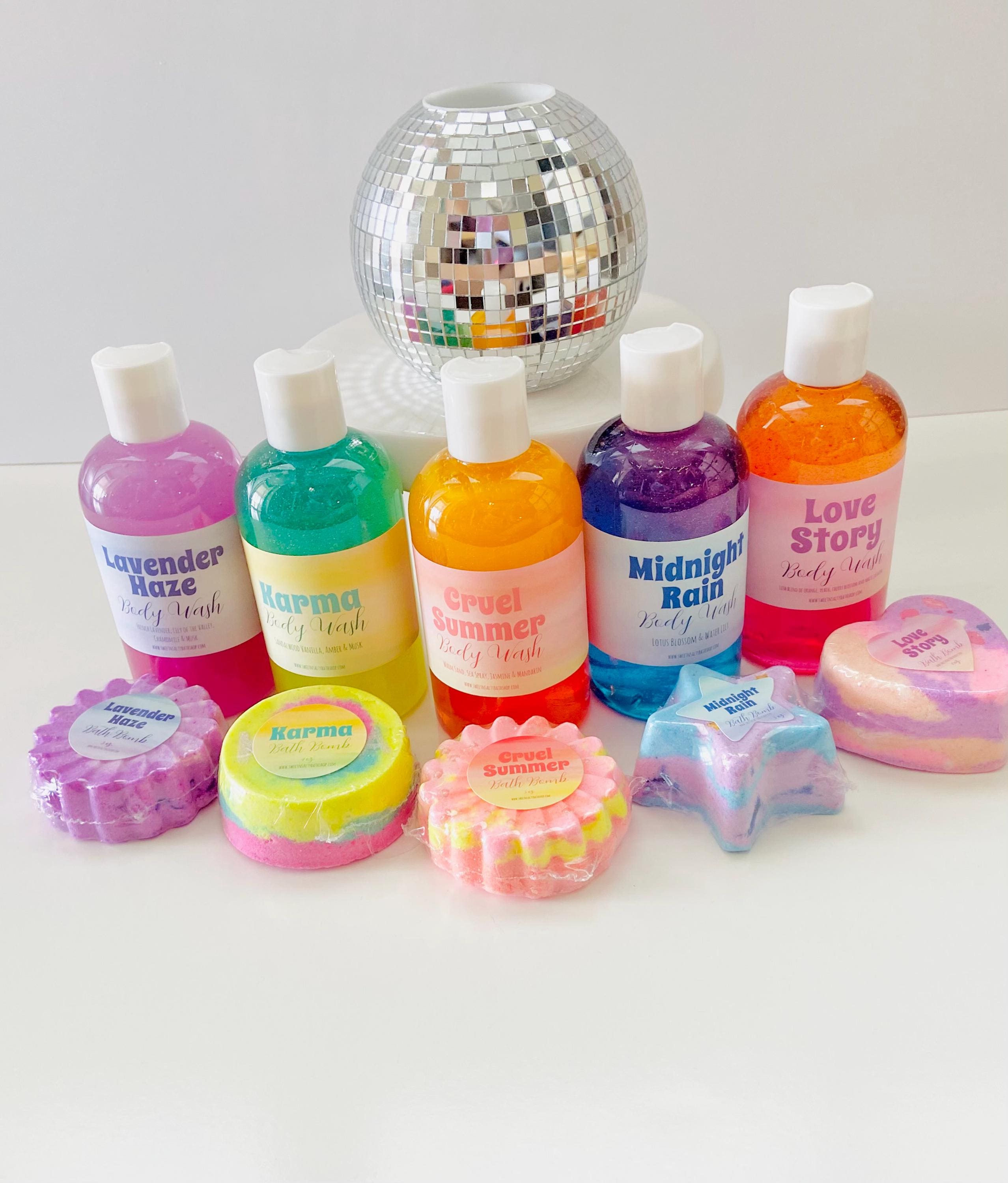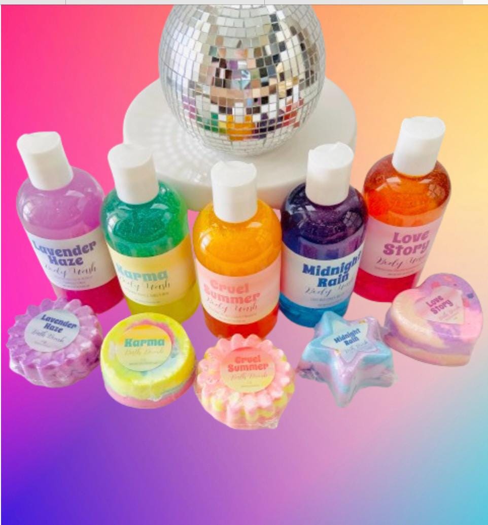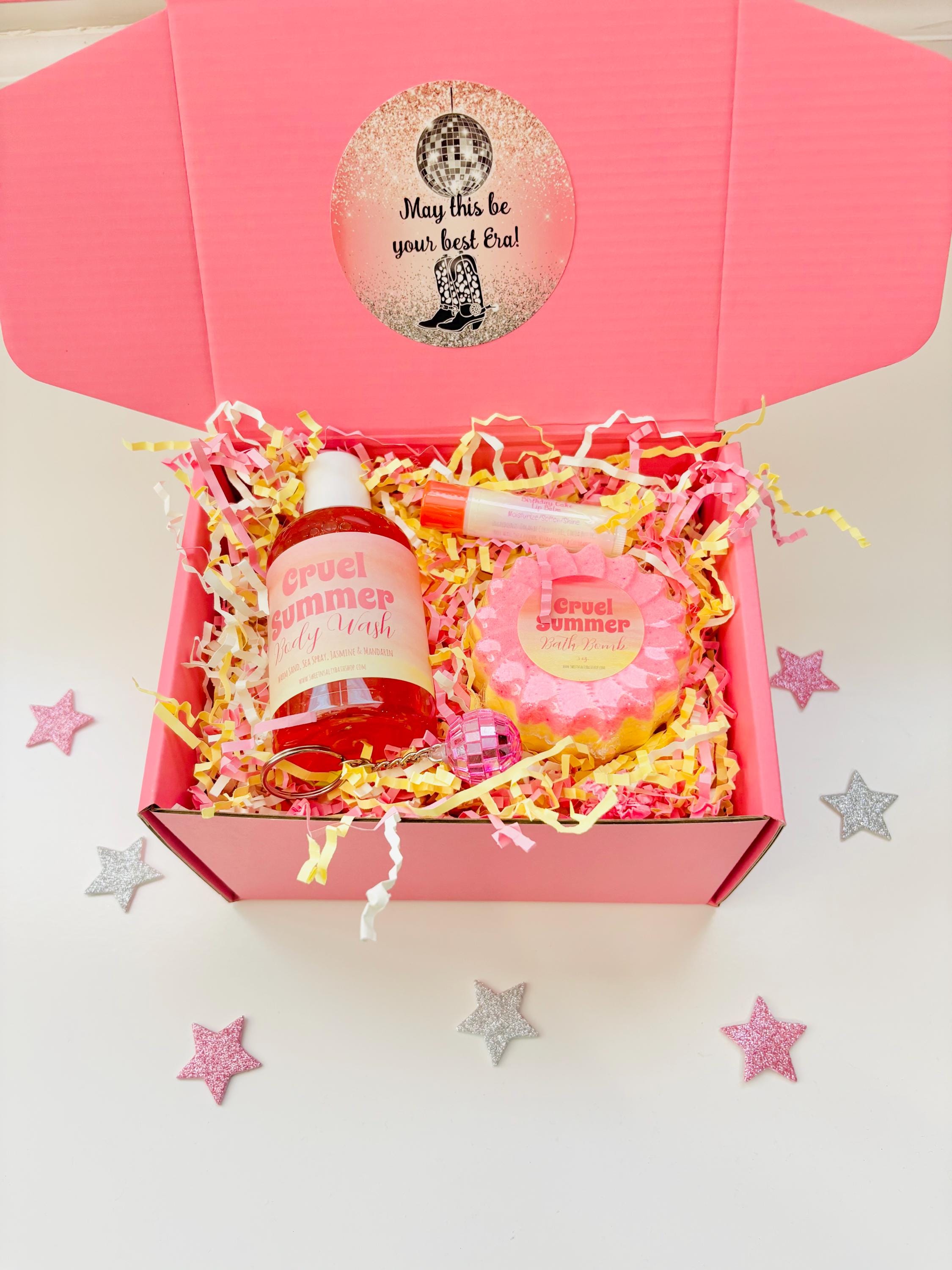 Taylor fans will love this adorable gift box filled with fun bath goodies. Each box comes with your scent choice of one bath bomb, one 4 oz shimmering body wash, one lip balm, friendship bracelet, and a disco ball key chain. If you would like two different scents for the bath bomb and body wash, choose custom in the drop down menu and leave scent choices in the note to seller when checking out. These boxes can be customized with extra items as well. Message me for detailed pricing or any questions you may have. This item ships USPS Priority mail.